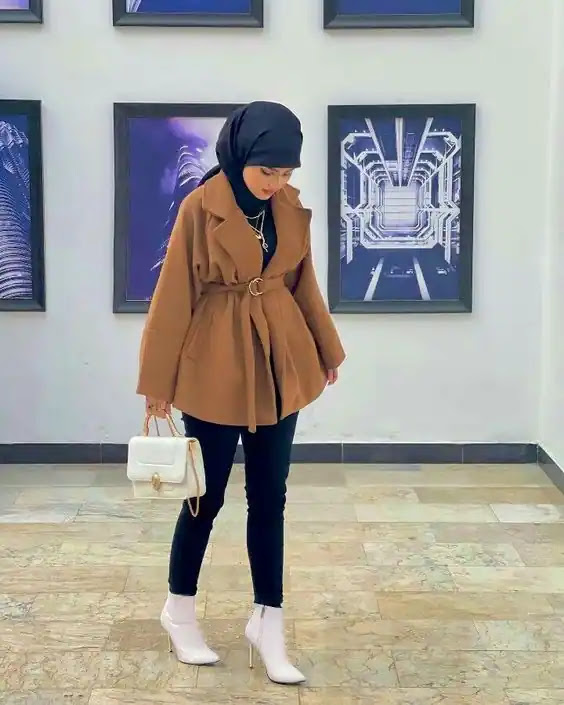 - لا غني عن هذا الاستايل في لبس شتوي للمحجبات حيث يعطي مظهر أنيق ومميز وهو عبارة عن جاكت قصير يتوسطه حزام .